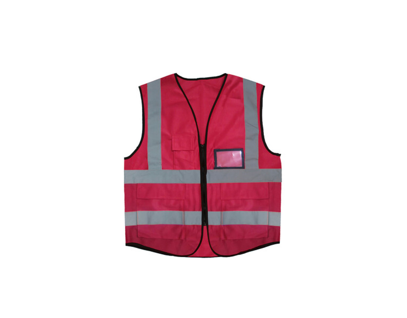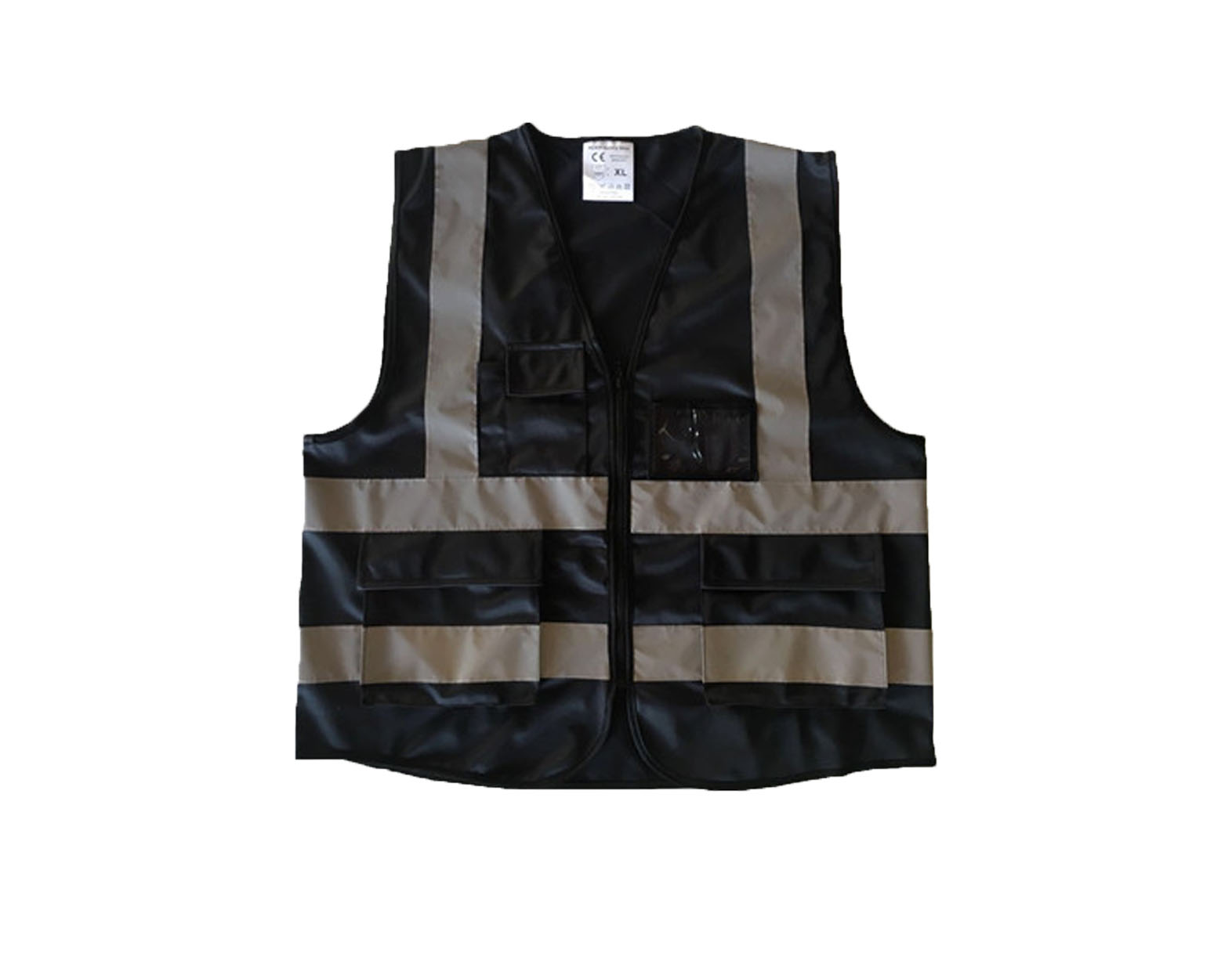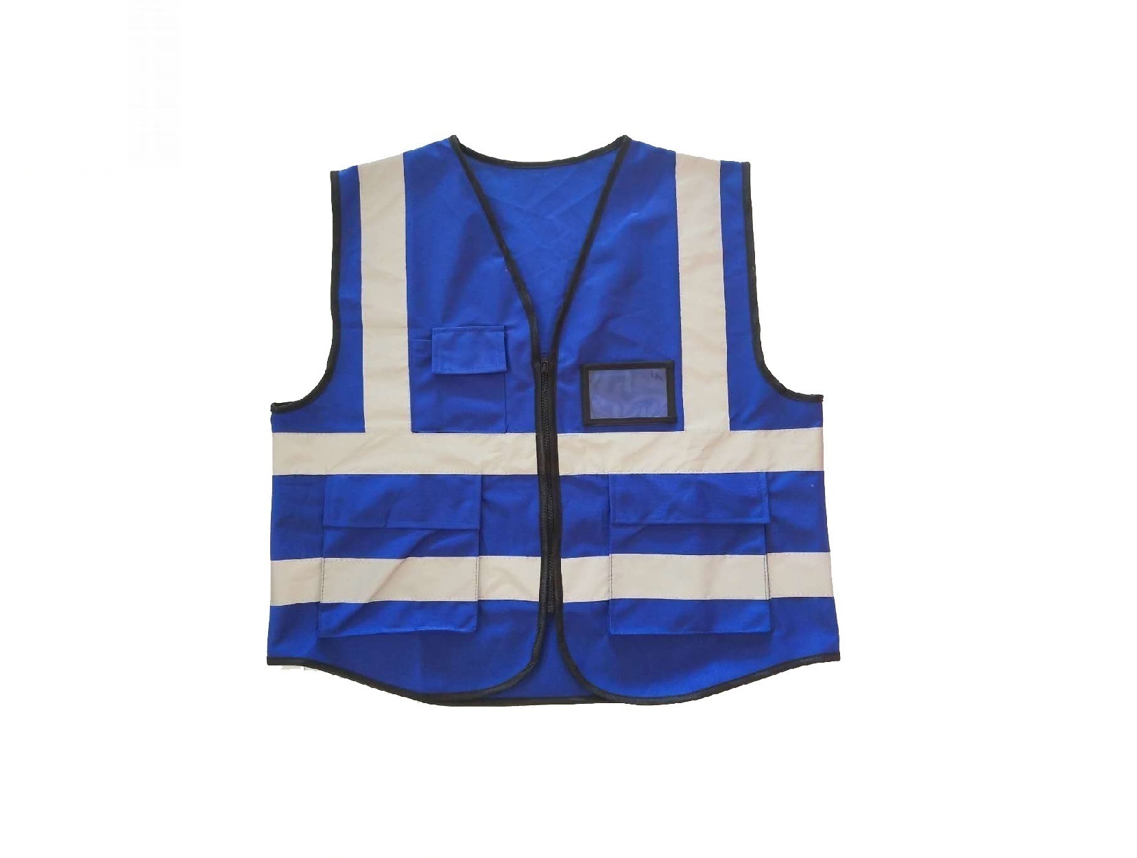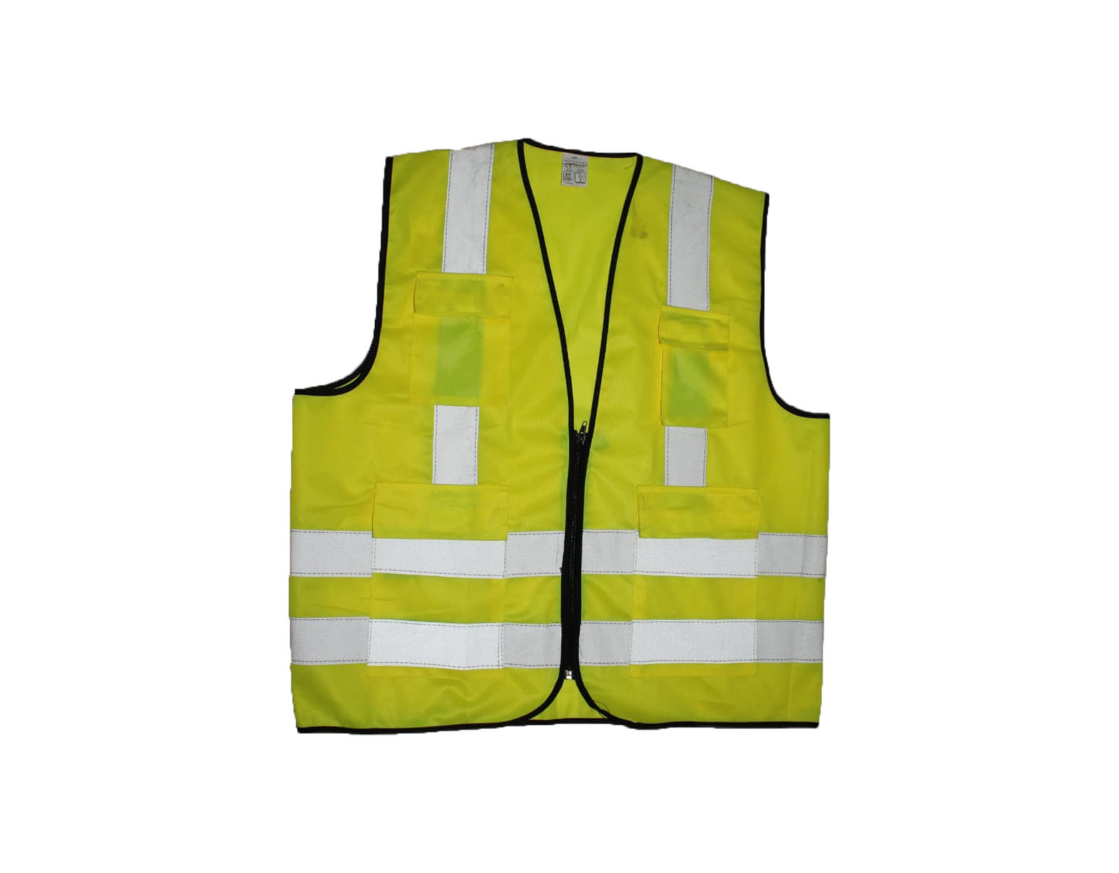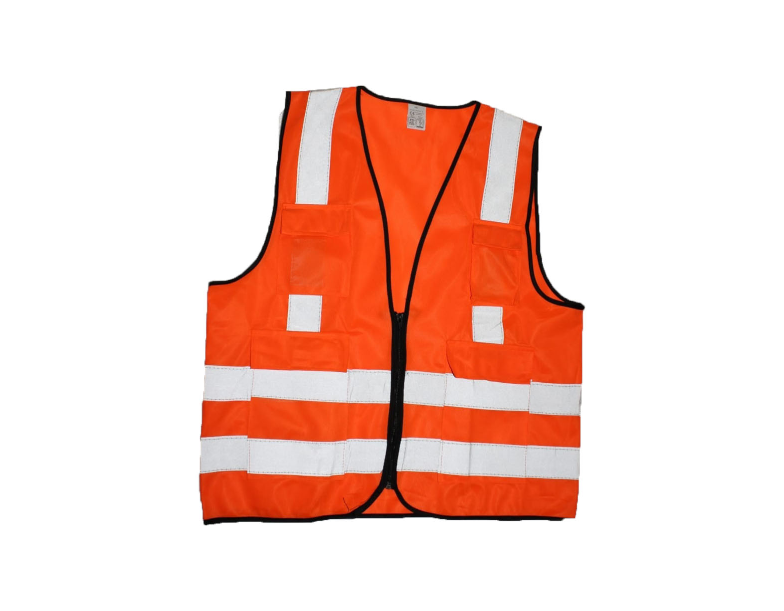 قابلية عالية للرؤية والانعكاس: سترة صفراء او برتقالية نيون مع شرائط فضية عاكسة تلف سترة الأمان بالكامل.