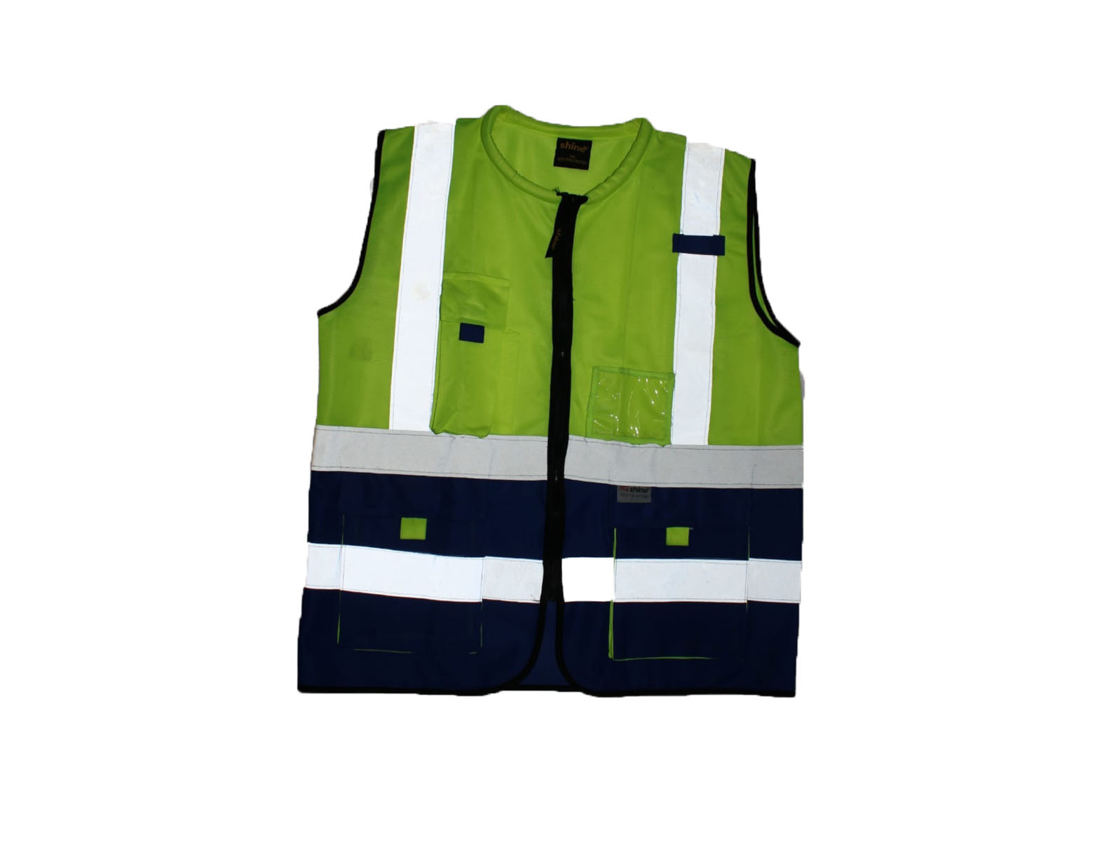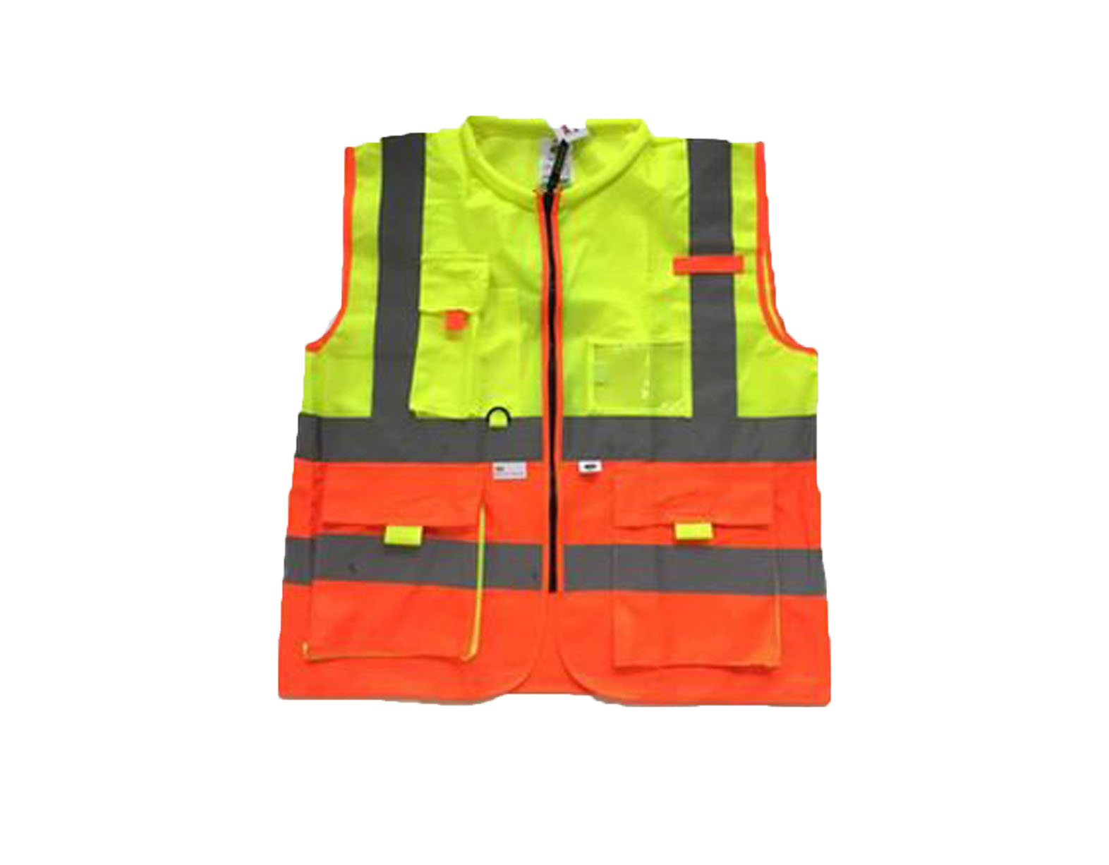 قابلية عالية للرؤية والانعكاس: سترة صفراء او برتقالية نيون مع شرائط فضية عاكسة تلف سترة الأمان بالكامل.