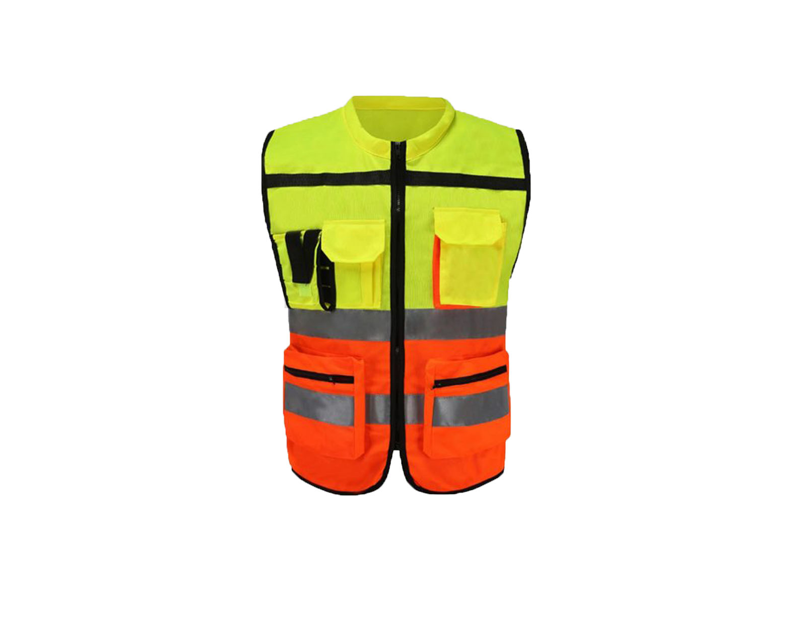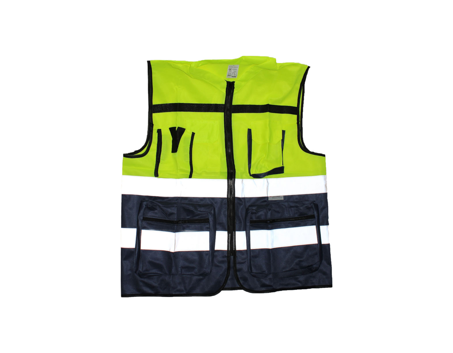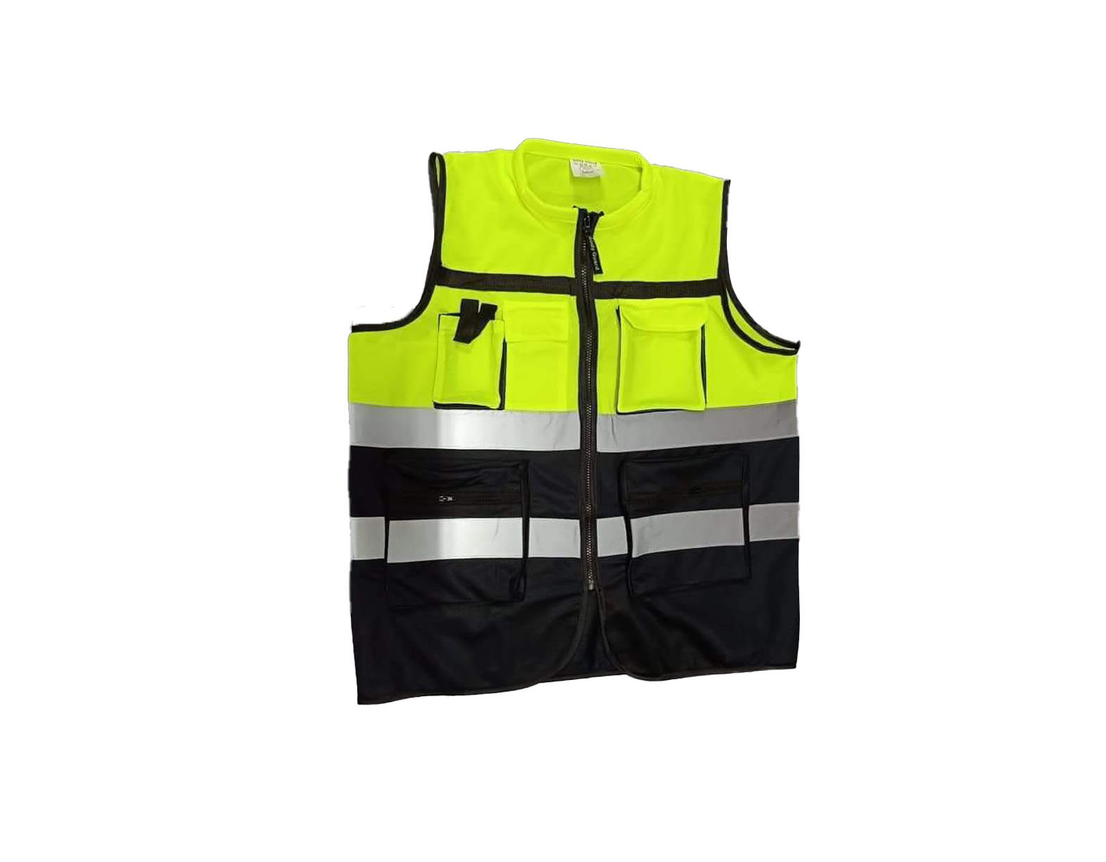 سترة قماشية ثنائية اللون، 4 أشرطة عاكسة عالية الوضوح مع 3 جيوب، 1 جيب للقلم وجيب واحد لبطاقة الهوية مع سحاب